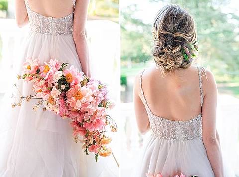 The second model is wearing the Paisley Gown from Enaura Bridal. This gown has a deep sweetheart neckline, and embroidered bodice and a really fun cascading layered full skirt. The model’s hair is woven in a loose fishtail braid fashioned into an updo. Florals are woven in the side of this romantic style. The flowers paired with this gown are a large arching peach bouquet that when held creates a stunning cascading presentation bouquet.