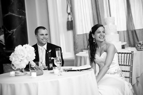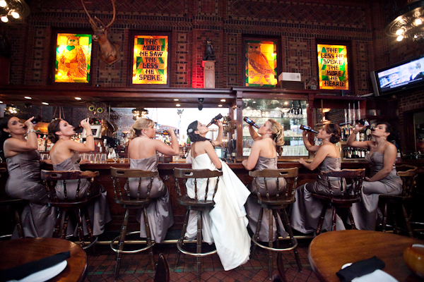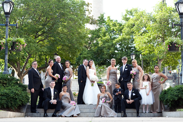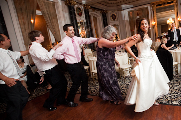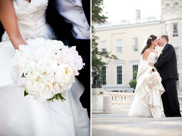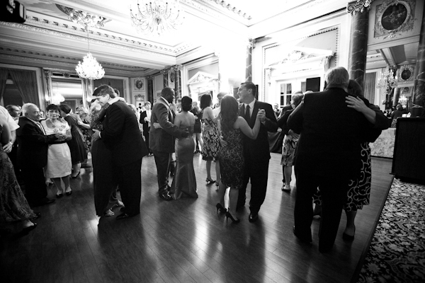 From the photographer, Wendy Hickok: “We took the wedding party to Mount Vernon, one of my favorite areas in Baltimore. I love using the cobbled streets, the church with the red doors, the fountains, and the monument in photos. Their reception at the Belvedere was super swanky. I love the dark wood panelling, the antique gold elevator, the outdoor singe that lights up at night, and the crystal chandeliers. The toasts brought on lots of tears, they had an anniversary dance, and the garter toss was by far the silliest moment of the evening.