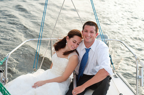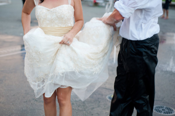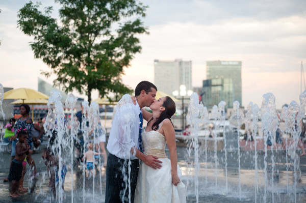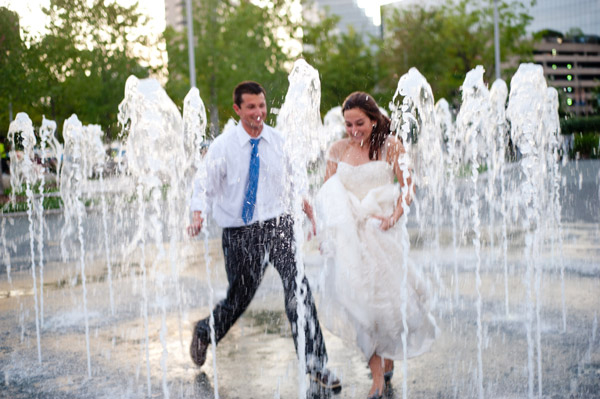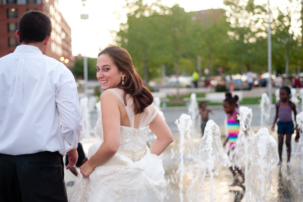 From Hannah: “Steve and I wanted to do a Trash the Dress session so we could get some spontaneous, fun photos of us doing things we never would’ve dared to do on our wedding day! We are excited because they capture a playful and spontaneous side to our relationship. At first, Steve wanted us to jump in the harbor or a pool, but we compromised by running through the fountains, which was so refreshing. There were a ton of kids playing in the fountains because it was such a hot day. Interestingly, they didn’t pay us any attention, as though it is totally normal to see adults in a wedding dress and tux in a fountain. The adults, on the other hand, clearly thought we had lost our mind. We got lots of funny stares.”