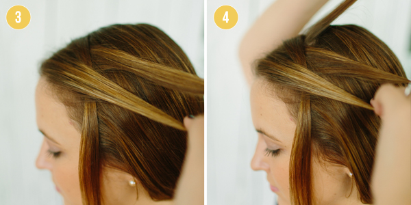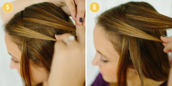 Step 4: Let the left piece of hair fall (you no longer need to hold onto it) and pick up a small piece of hair near the right strand of hair…