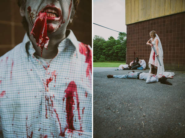 From Jill: “We were trying to figure out something cool, but not typical. Rita loves horror, Nick likes cowboys, and they both wanted to have fun with it. That is how Cowboys versus Zombies came about! She found all of the makeup tutorials online, we made a bunch of edible blood, and Rita bought some fake blood. It was such a great combination of us all working together… not to mention such a blast to capture! It’s not every day a bride wants to slather her wedding dress in gross, sticky blood!”